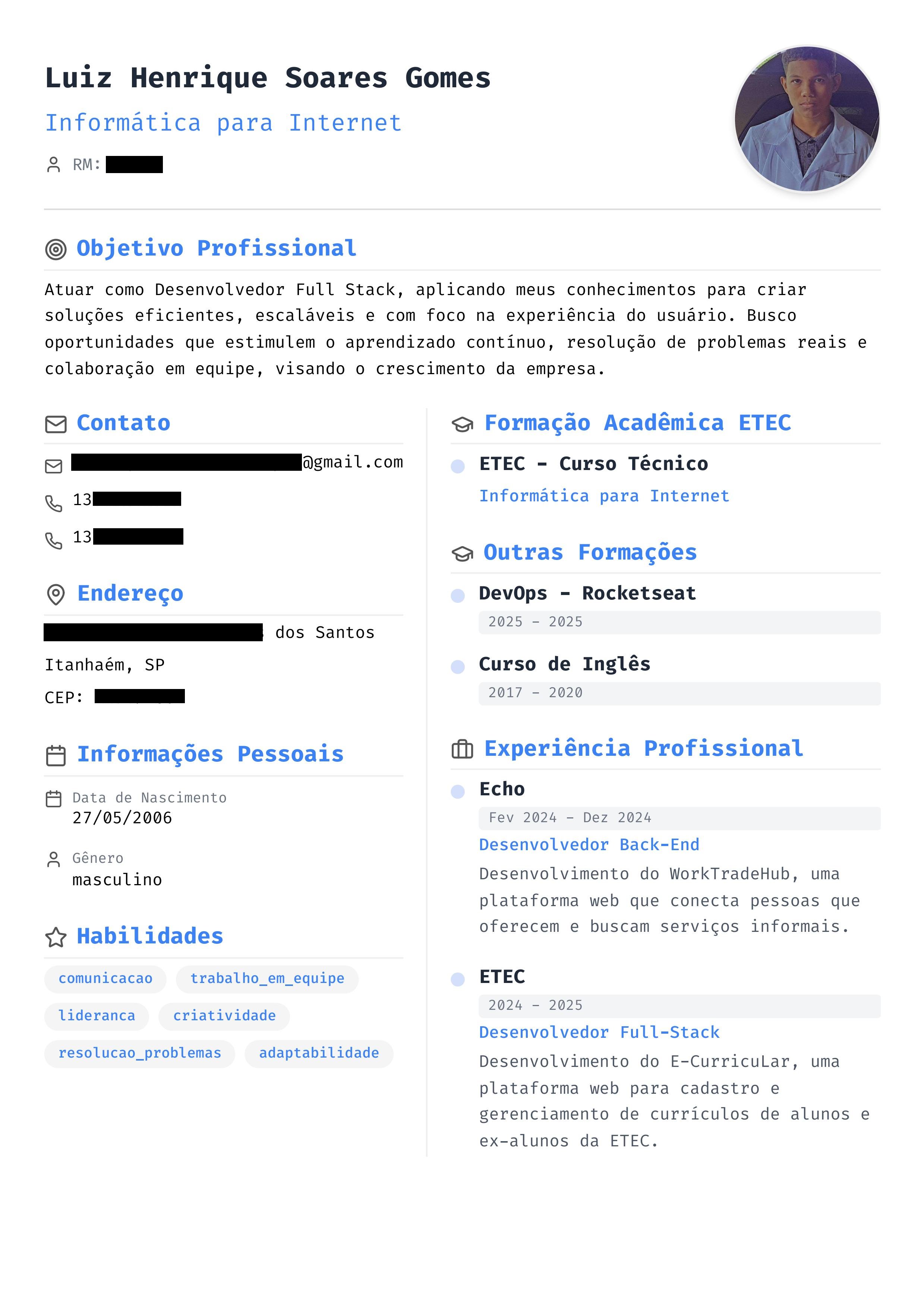 Crie, gerencie e compartilhe seu currículo profissional de forma simples e eficiente. Desenvolvido especialmente para alunos da ETEC.